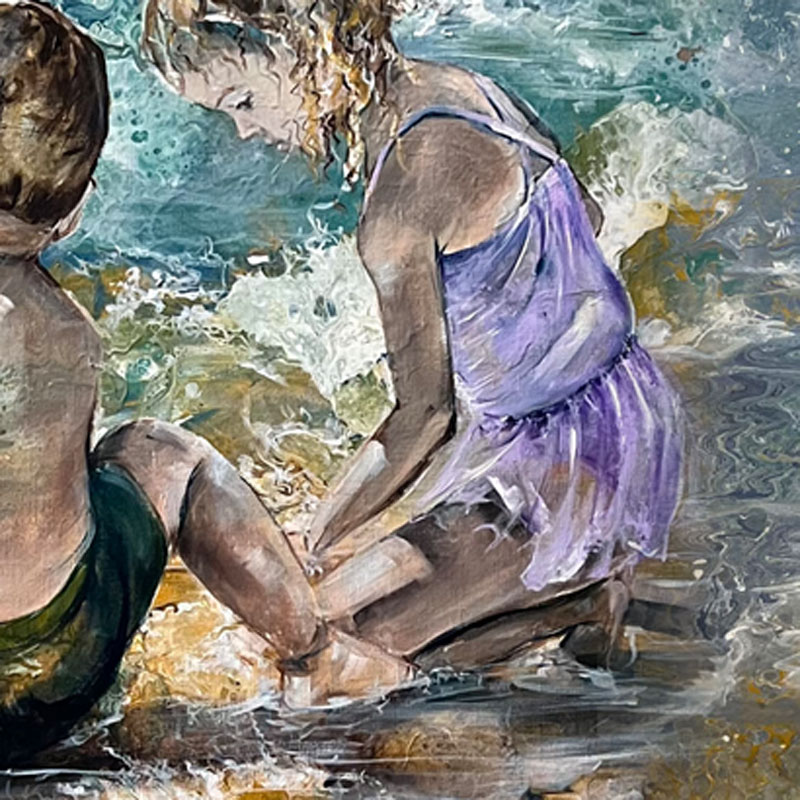 „Voolamise teine viis“ avab sama teema teise külje. Meri on türkiissinine, kontrastid tugevamad ja laste riietes rohkem värvi. Töö on erksam, kirkam ja mängulisem – vool, mis liigub uues rütmis, erinevalt esimesest maalist.